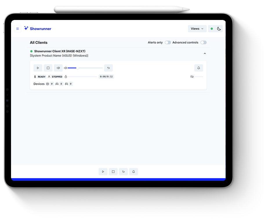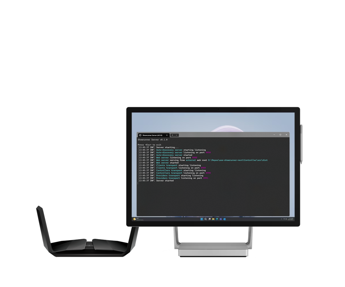 The Showrunner server runs on a pc on the network, while the controller for show management is accessible through a browser or PWA on any device on the network, allowing as many people as required to have full control over the smooth operation of your LBE or real-time installation. Clients can connect wirelessly or cabled.