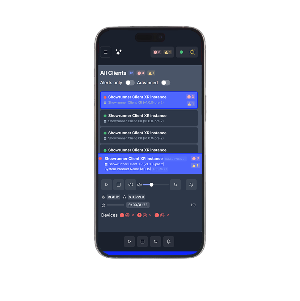 Showrunner is a flexible, highly-configurable and simple-to-use show control system for managing, monitoring and running multiple instances of software and realtime experiences for anywhere from one to hundreds of simultaneous users. across multiple device platforms, including standalone and XR headsets, Android and iOS devices and Windows and macOS computers.With seamless integration, Showrunner can manage any connected application as part of a wider show, exhibition, or installation—whether it's screen-based or an application/device integral to running the production, all can be setup as Showrunner clients through integration of the Showrunner Client SDK.Setup is quick and intuitive, allowing producers and technicians to bring together diverse components into one unified system that adapts to both permanent installations and touring productions.For developers and testers, Showrunner offers a powerful layer of external control over games and real-time applications. Integrated with just a few lines of code, it enables remote toggling of debug features, logging, and user states—making it ideal for large-scale user testing and QA. This lets teams monitor and fine-tune experiences in real-time, across multiple devices, without interrupting the user journey.